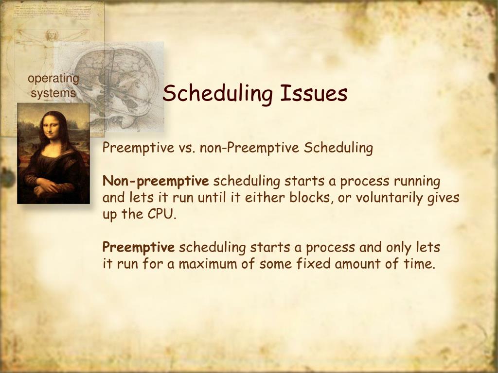 operating systems Scheduling Issues Preemptive vs. non-Preemptive Scheduling Non-preemptive scheduling starts a process running and lets it run until it either blocks, or voluntarily gives up the CPU. Preemptive scheduling starts a process and only lets it run for a maximum of some fixed amount of time.