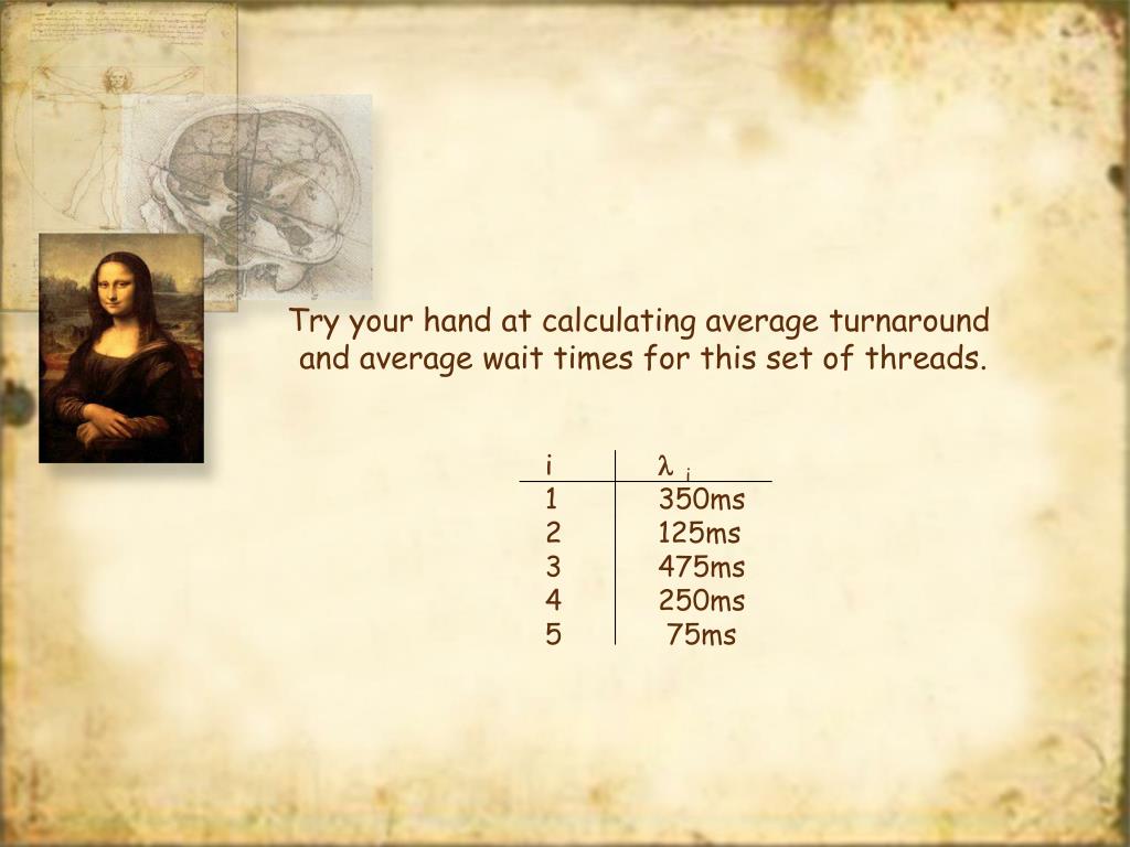Try your hand at calculating average turnaround and average wait times for this set of threads. i i 1 350ms 2 125ms 3 475ms 4 250ms 5 75ms