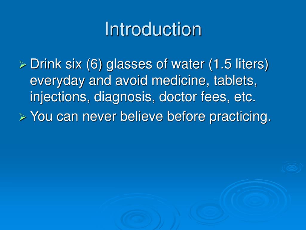 Introduction • Drink six (6) glasses of water (1.5 liters) everyday and avoid medicine, tablets, injections, diagnosis, doctor fees, etc. • You can never believe before practicing.