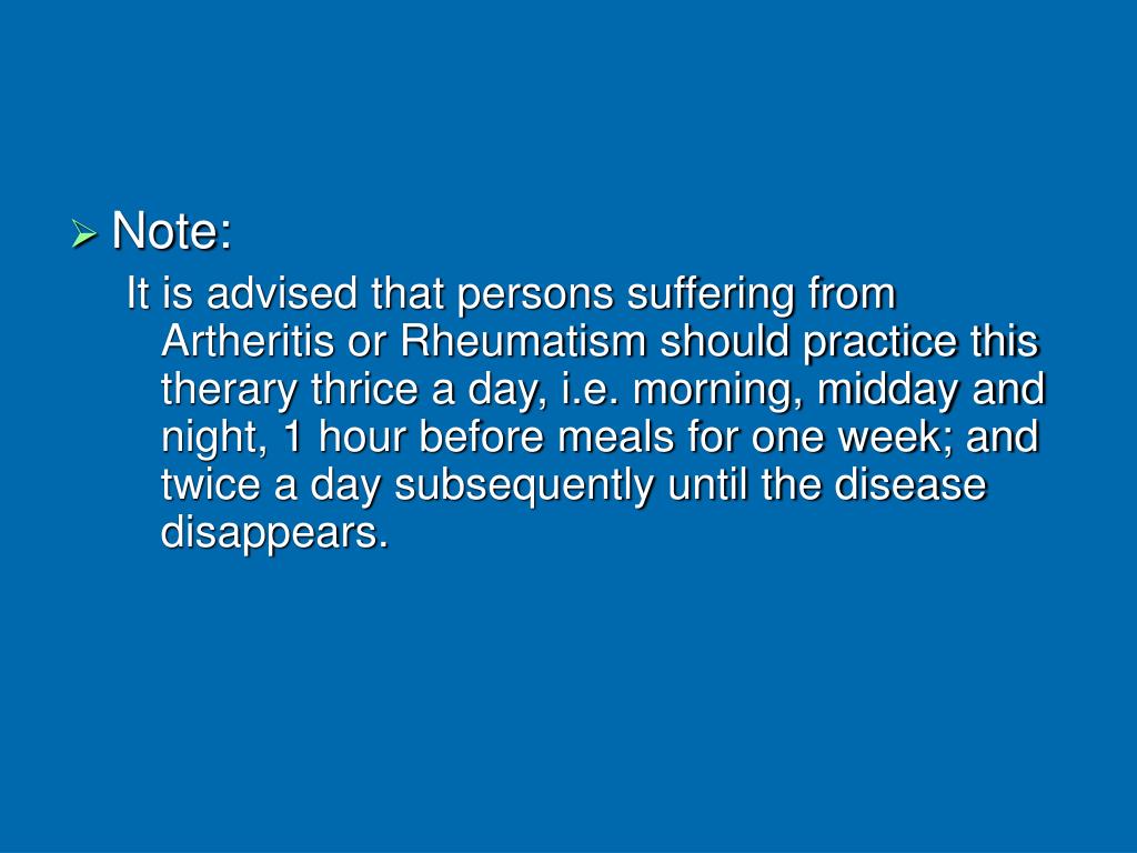 Note: It is advised that persons suffering from Artheritis or Rheumatism should practice this therary thrice a day, i.e. morning, midday and night, 1 hour before meals for one week; and twice a day subsequently until the disease disappears.