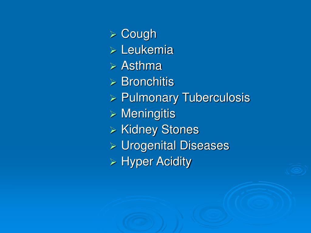 Cough • Leukemia • Asthma • Bronchitis • Pulmonary Tuberculosis • Meningitis • Kidney Stones • Urogenital Diseases • Hyper Acidity