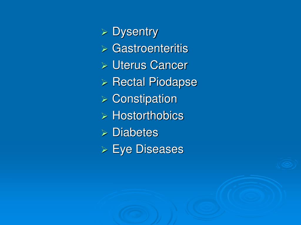 Dysentry • Gastroenteritis • Uterus Cancer • Rectal Piodapse • Constipation • Hostorthobics • Diabetes • Eye Diseases