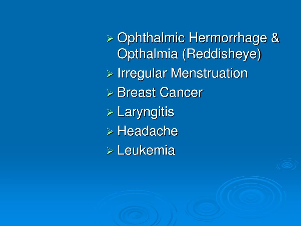Ophthalmic Hermorrhage & Opthalmia (Reddisheye) • Irregular Menstruation • Breast Cancer • Laryngitis • Headache • Leukemia