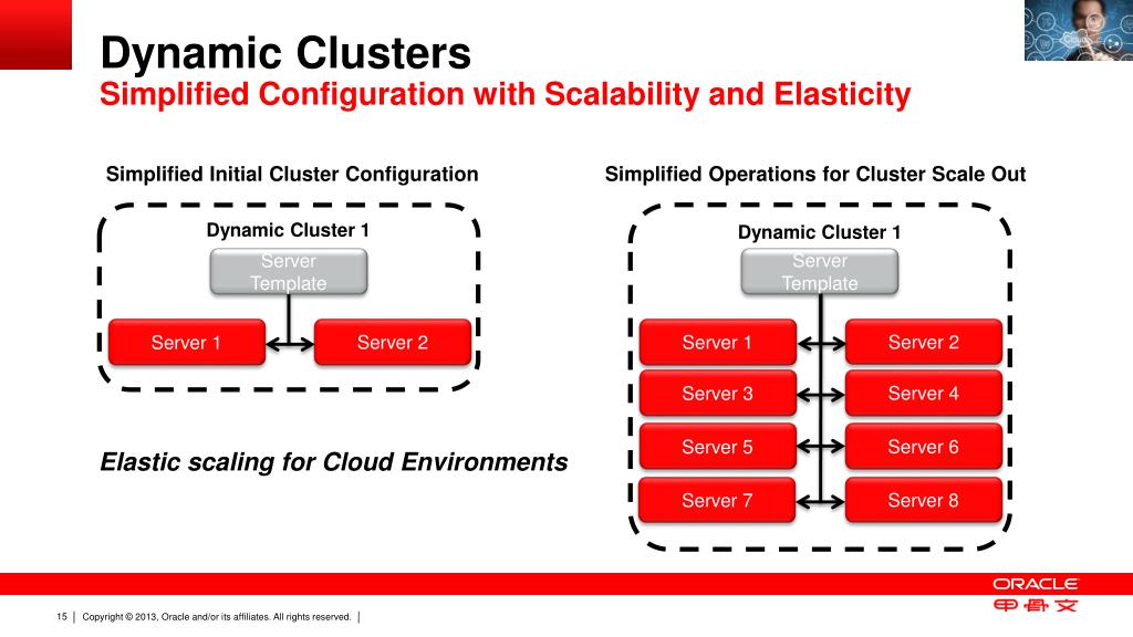 Dynamic ClustersSimplified Configuration with Scalability and Elasticity Simplified Operations for Cluster Scale Out Simplified Initial Cluster Configuration Dynamic Cluster 1 Dynamic Cluster 1 Server Template Server Template Server 2 Server 2 Server 1 Server 1 Server 4 Server 3 Server 6 Server 5 Elastic scaling for Cloud Environments Server 8 Server 7