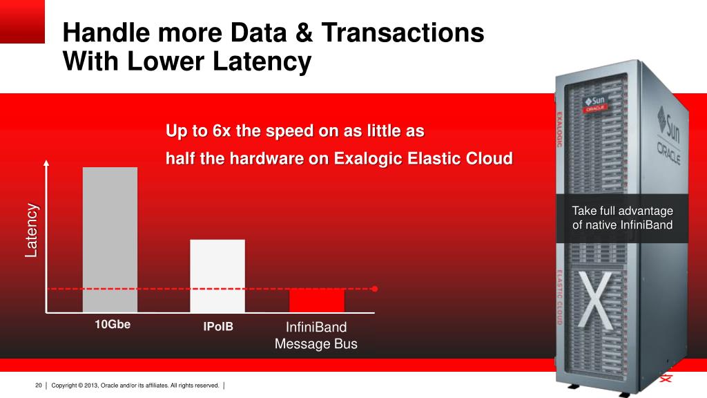 Handle more Data & TransactionsWith Lower Latency Up to 6x the speed on as little as half the hardware on Exalogic Elastic Cloud Take full advantage of native InfiniBand Latency 10Gbe InfiniBand Message Bus IPoIB