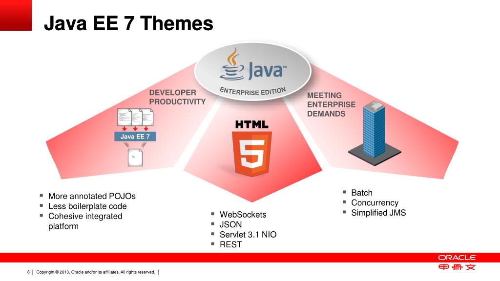 Java EE 7 Themes Java EE 7 Themes DEVELOPER PRODUCTIVITY MEETING ENTERPRISE DEMANDS Java EE 7 ENTERPRISE EDITION • Batch • Concurrency • Simplified JMS • More annotated POJOs • Less boilerplate code • Cohesive integrated platform • WebSockets • JSON • Servlet 3.1 NIO • REST