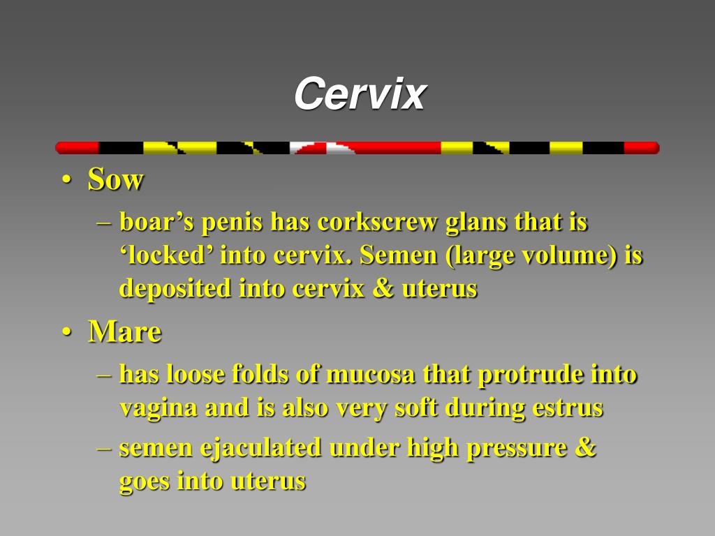Cervix • Sow • boar’s penis has corkscrew glans that is ‘locked’ into cervix. Semen (large volume) is deposited into cervix & uterus • Mare • has loose folds of mucosa that protrude into vagina and is also very soft during estrus • semen ejaculated under high pressure & goes into uterus
