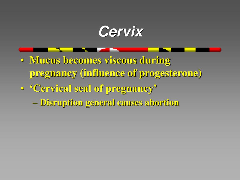 Cervix • Mucus becomes viscous during pregnancy (influence of progesterone) • ‘Cervical seal of pregnancy’ • Disruption general causes abortion