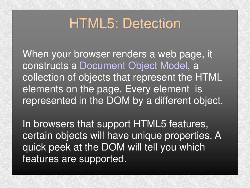 When your browser renders a web page, it constructs a Document Object Model, a collection of objects that represent the HTML elements on the page. Every element is represented in the DOM by a different object. In browsers that support HTML5 features, certain objects will have unique properties. A quick peek at the DOM will tell you which features are supported. HTML5: Detection
