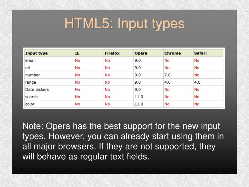 Note: Opera has the best support for the new input types. However, you can already start using them in all major browsers. If they are not supported, they will behave as regular text fields. HTML5: Input types