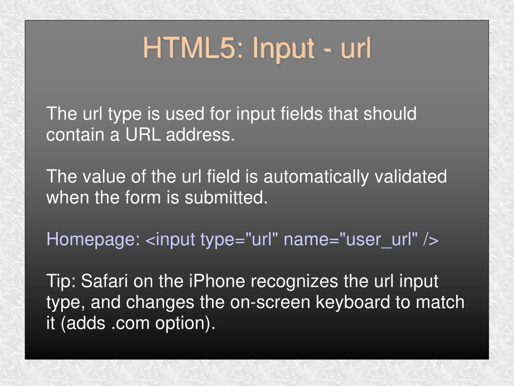 The url type is used for input fields that should contain a URL address. The value of the url field is automatically validated when the form is submitted. Homepage: <input type="url" name="user_url" /> Tip: Safari on the iPhone recognizes the url input type, and changes the on-screen keyboard to match it (adds .com option). HTML5: Input - url