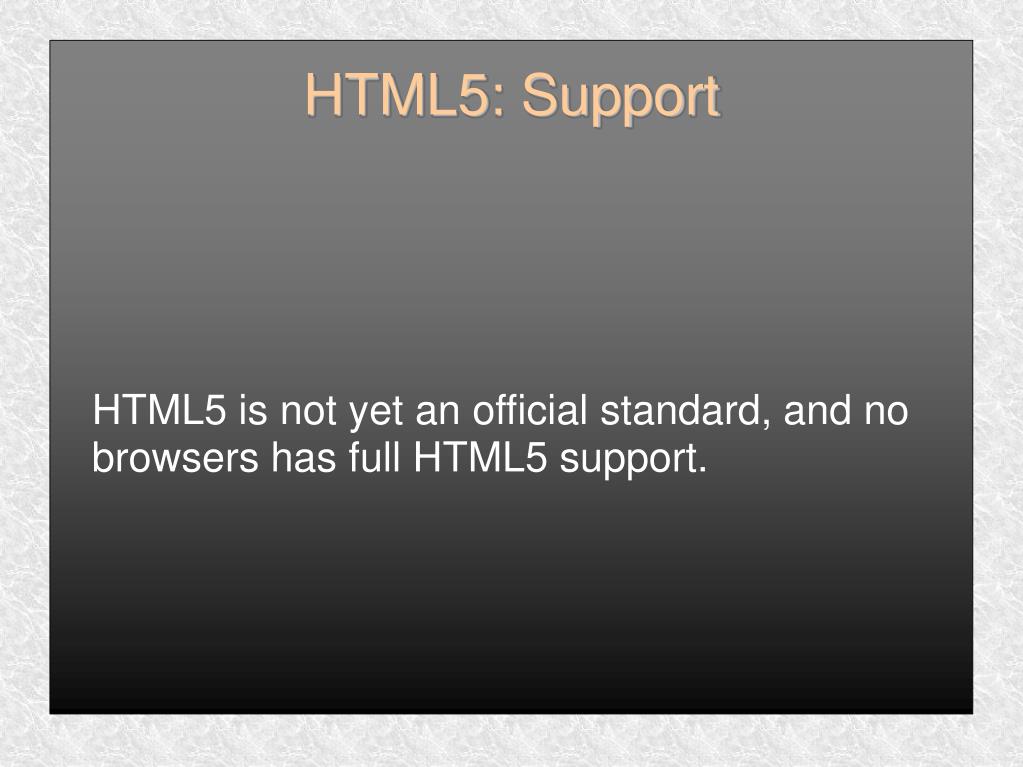HTML5 is not yet an official standard, and no browsers has full HTML5 support. HTML5: Support