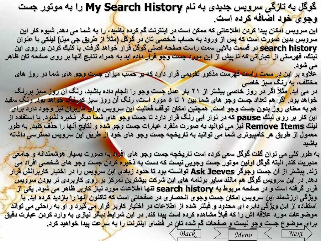 گوگل به تازگى سرويس جديدى به نام My Search History را به موتور جست وجوى خود اضافه كرده است. اين سرويس امكان پيدا كردن اطلاعاتى كه ممكن است در اينترنت گم كرده باشيد، را به شما مى دهد. شيوه كار اين سرويس بدين صورت است كه پس از ورود به حساب شخصى تان در گوگل (مثلاً از طريق جى ميل) لينكى با عنوان search history در قسمت بالايى سمت راست صفحه اصلى گوگل قرار خواهد گرفت. با كليك كردن بر روى اين لينك، فهرستى از عباراتى كه تا پيش از اين مورد جست وجو قرار داده ايد به همراه نتايج آنها بر روى صفحه تان ظاهر مى شود.علاوه بر اين در سمت راست فهرست مذكور تقويمى قرار دارد كه بر حسب ميزان جست وجو هاى شما در روز هاى مختلف، به رنگ سبز خاصىدر مى آيد. مثلاً اگر در روز خاصى بيشتر از ۲۱ بار عمل جست وجو را انجام داده باشيد، رنگ آن روز سبز پررنگ خواهد بود. اگر هم تعداد جست وجو هاى شما بين ۱ تا ۵ مورد است، رنگ آن روز سبز كمرنگ خواهد بود. رنگ سفيد هم به معناى روز بدون جست وجو است. همچنين امكان توقف فعاليت اين سرويس براى كاربران نيز وجود دارد براى اين كار بر روى لينك pause كه در نوار آبى رنگ قرار دارد تا جست وجو هاى شما ديگر ذخيره نشود. با استفاده از لينك Remove Items نيز مى توانيد به صورت منفرد عبارات جست وجو شده و نتايج آنها را حذف كنيد. به طور معمول از طريق هر كامپيوترى شما مى توانيد به تاريخچه جست وجو هاى خود از طريق اين سرويس دسترسى داشته باشيد به طور كلى مى توان گفت گوگل سعى كرده است تاريخچه جست وجو هاى افراد به صورت بسيار هوشمندانه و جامعى مديريت كند. البته گوگل اولين موتور جست وجويى نيست كه دست به ذخيره كردن جست وجو هاى شخصى افراد مى زند. پيشتر از آن جست وجوگر Ask Jeeves توانسته بود تا حدود زيادى اين سرويس را در اختيار كاربرانش قرار دهد. در اين سرويس گوگل هم مانند ساير برنامه هاى اين شركت بيشترين تمركز بر روى كاربردى تر بودن سرويس قرار گرفته است و در صفحه مربوط به search history تنها اطلاعات مورد نياز كاربر ظاهر مى شود. يكى از ويژگى ارزشمند اين سرويس امكان جست وجوى انحصارى در صفحاتى است كه تاكنون آنها را بازديد كرده ايد. با استفاده از اين ويژگى دايره اى محدود و فيلتر شده از اطلاعات در اختيار كاربر قرار مى گيرد و او به راحتى مى تواند موضوعات مورد علاقه اش را كه قبلاً مشاهده كرده است پيدا كند. در اين شرايط ديگر نيازى به وارد كردن عبارت دقيق براى موضوع جست وجو نيست و صفحات گم شده تان در فضاى اينترنت را به سرعت پيدا خواهيد كرد. Back Next Meno