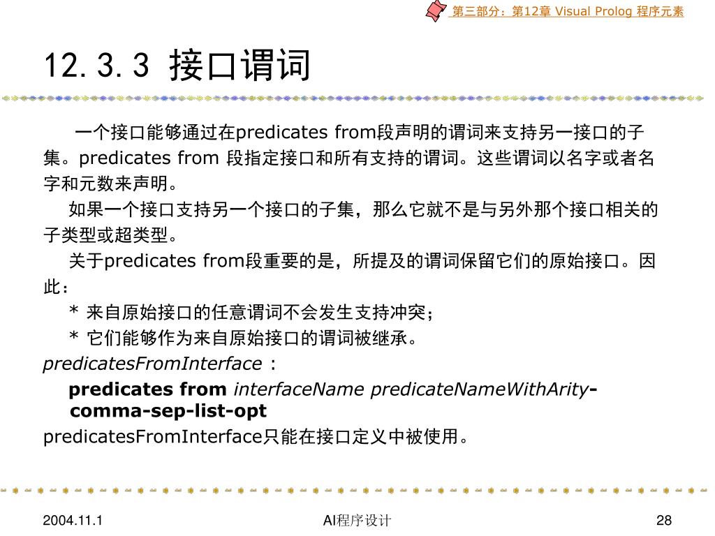 12.3.3 接口谓词 • 举例 • interface aaa • predicates • ppp : (). • qqq : (). • end interface aaa • interface bbb • predicates from aaa • ppp • predicates • rrr : (). • end interface bbb • interface ccc supports aaa, bbb • end interface ccc • 即使aaa和bbb都声明了谓词ppp,但ccc可以不产生任何冲突地支持二者。这是因为ppp在所有情况下都含有aaa,将其作为原始接口。 AI程序设计