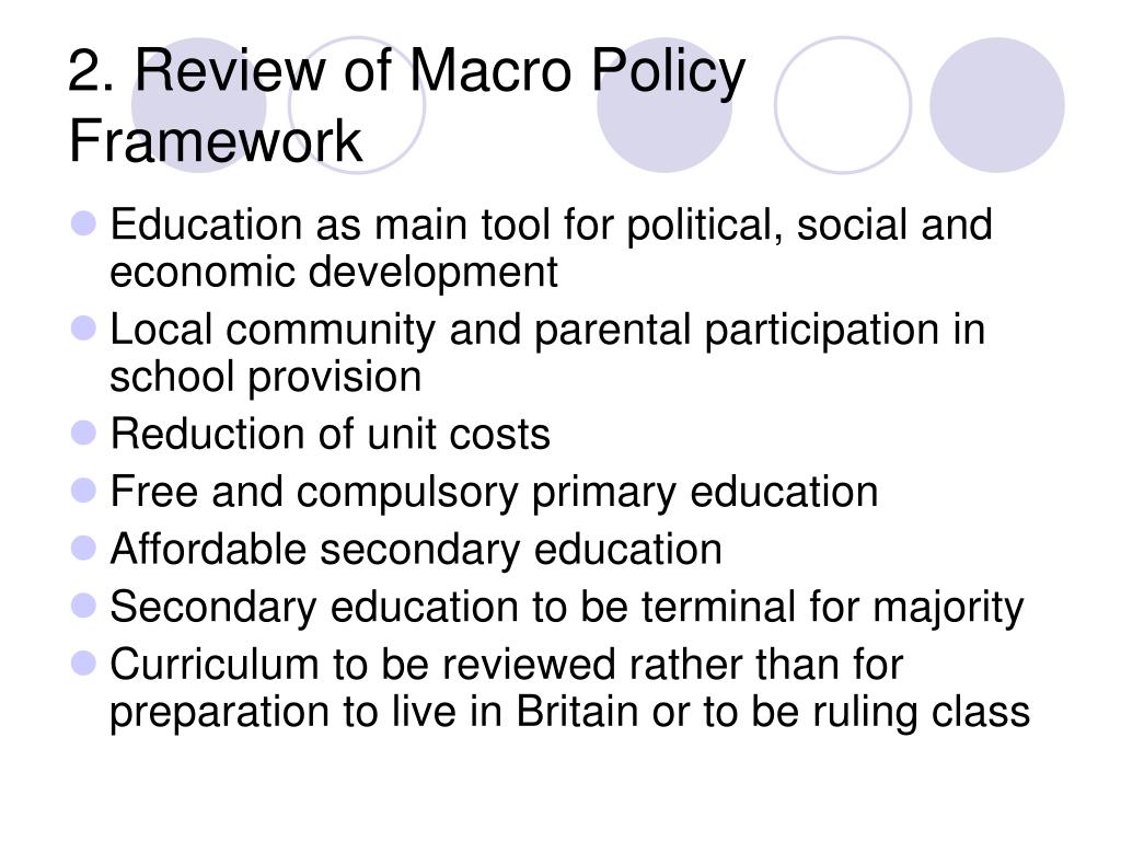 2. Review of Macro Policy Framework • Education as main tool for political, social and economic development • Local community and parental participation in school provision • Reduction of unit costs • Free and compulsory primary education • Affordable secondary education • Secondary education to be terminal for majority • Curriculum to be reviewed rather than for preparation to live in Britain or to be ruling class
