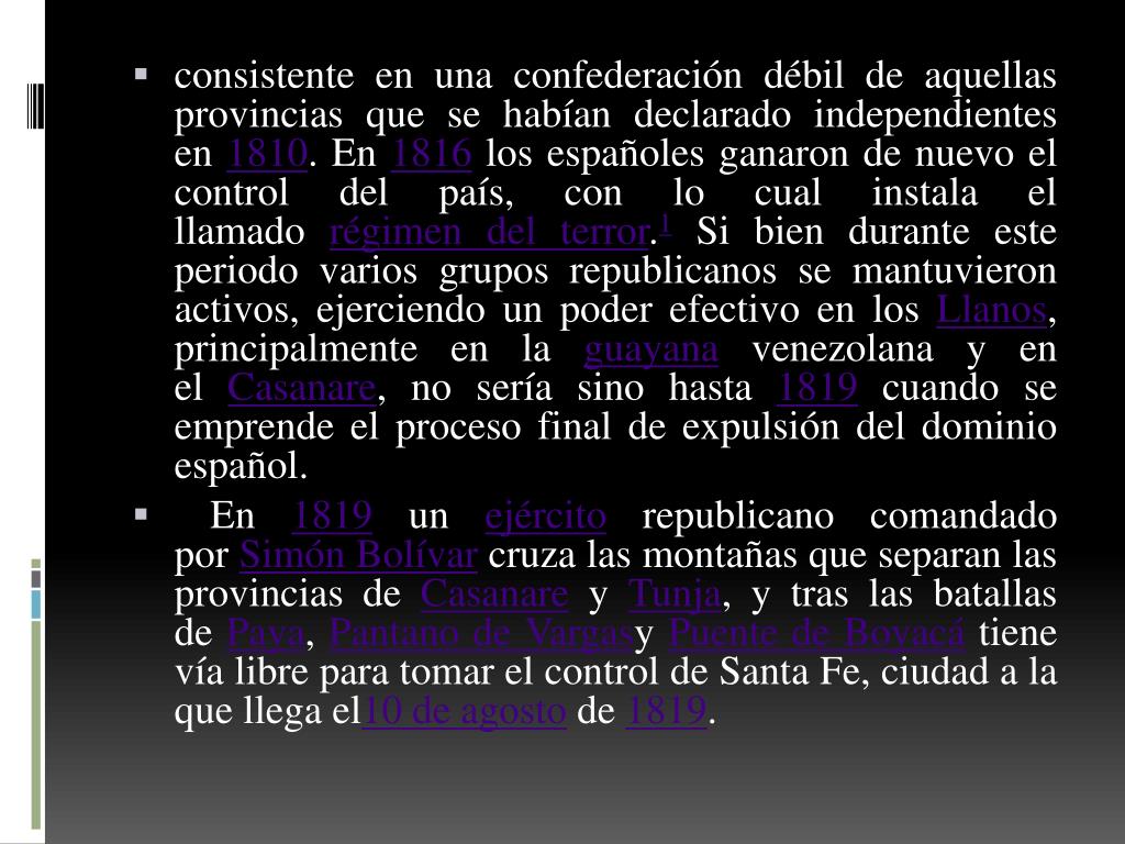 consistente en una confederación débil de aquellas provincias que se habían declarado independientes en 1810. En 1816 los españoles ganaron de nuevo el control del país, con lo cual instala el llamado régimen del terror.1 Si bien durante este periodo varios grupos republicanos se mantuvieron activos, ejerciendo un poder efectivo en los Llanos, principalmente en la guayana venezolana y en el Casanare, no sería sino hasta 1819 cuando se emprende el proceso final de expulsión del dominio español. • En 1819 un ejército republicano comandado por Simón Bolívar cruza las montañas que separan las provincias de Casanare y Tunja, y tras las batallas de Paya, Pantano de VargasyPuente de Boyacá tiene vía libre para tomar el control de Santa Fe, ciudad a la que llega el10 de agosto de 1819.