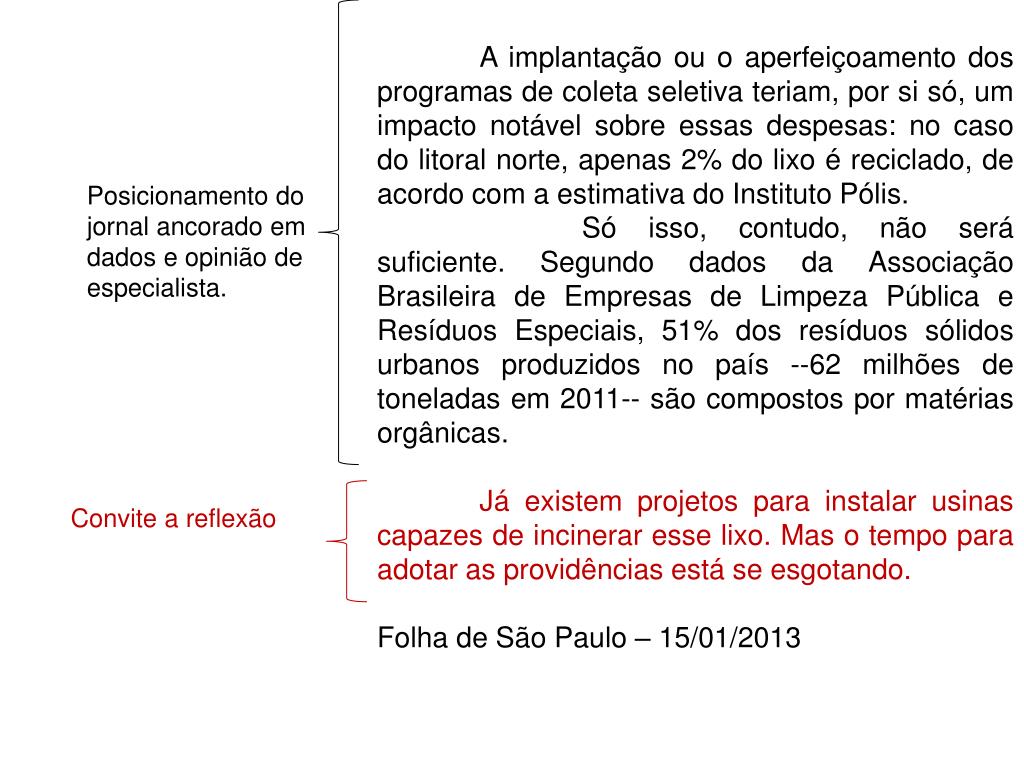 A implantação ou o aperfeiçoamento dos programas de coleta seletiva teriam, por si só, um impacto notável sobre essas despesas: no caso do litoral norte, apenas 2% do lixo é reciclado, de acordo com a estimativa do Instituto Pólis. Só isso, contudo, não será suficiente. Segundo dados da Associação Brasileira de Empresas de Limpeza Pública e Resíduos Especiais, 51% dos resíduos sólidos urbanos produzidos no país --62 milhões de toneladas em 2011-- são compostos por matérias orgânicas. Já existem projetos para instalar usinas capazes de incinerar esse lixo. Mas o tempo para adotar as providências está se esgotando. Folha de São Paulo – 15/01/2013 Posicionamento do jornal ancorado em dados e opinião de especialista. Convite a reflexão