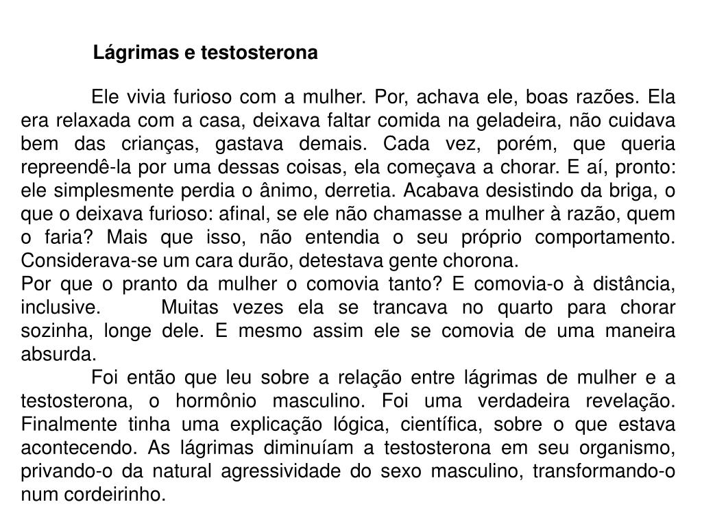 Lágrimas e testosterona Ele vivia furioso com a mulher. Por, achava ele, boas razões. Ela era relaxada com a casa, deixava faltar comida na geladeira, não cuidava bem das crianças, gastava demais. Cada vez, porém, que queria repreendê-la por uma dessas coisas, ela começava a chorar. E aí, pronto: ele simplesmente perdia o ânimo, derretia. Acabava desistindo da briga, o que o deixava furioso: afinal, se ele não chamasse a mulher à razão, quem o faria? Mais que isso, não entendia o seu próprio comportamento. Considerava-se um cara durão, detestava gente chorona. Por que o pranto da mulher o comovia tanto? E comovia-o à distância, inclusive. Muitas vezes ela se trancava no quarto para chorar sozinha, longe dele. E mesmo assim ele se comovia de uma maneira absurda. Foi então que leu sobre a relação entre lágrimas de mulher e a testosterona, o hormônio masculino. Foi uma verdadeira revelação. Finalmente tinha uma explicação lógica, científica, sobre o que estava acontecendo. As lágrimas diminuíam a testosterona em seu organismo, privando-o da natural agressividade do sexo masculino, transformando-o num cordeirinho.