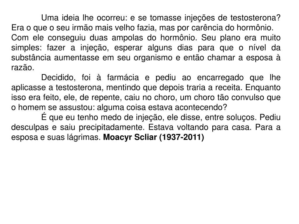 Uma ideia lhe ocorreu: e se tomasse injeções de testosterona? Era o que o seu irmão mais velho fazia, mas por carência do hormônio. Com ele conseguiu duas ampolas do hormônio. Seu plano era muito simples: fazer a injeção, esperar alguns dias para que o nível da substância aumentasse em seu organismo e então chamar a esposa à razão. Decidido, foi à farmácia e pediu ao encarregado que lhe aplicasse a testosterona, mentindo que depois traria a receita. Enquanto isso era feito, ele, de repente, caiu no choro, um choro tão convulso que o homem se assustou: alguma coisa estava acontecendo? É que eu tenho medo de injeção, ele disse, entre soluços. Pediu desculpas e saiu precipitadamente. Estava voltando para casa. Para a esposa e suas lágrimas. Moacyr Scliar (1937-2011)