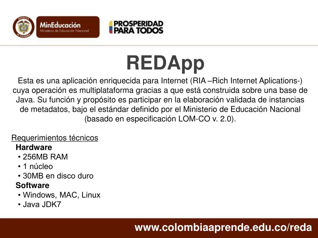 REDApp Esta es una aplicación enriquecida para Internet (RIA –Rich Internet Aplications-) cuya operación es multiplataforma gracias a que está construida sobre una base de Java. Su función y propósito es participar en la elaboración validada de instancias de metadatos, bajo el estándar definido por el Ministerio de Educación Nacional (basado en especificación LOM-CO v. 2.0). Requerimientos técnicos Hardware • 256MB RAM • 1 núcleo • 30MB en disco duro Software • Windows, MAC, Linux • Java JDK7 www.colombiaaprende.edu.co/reda