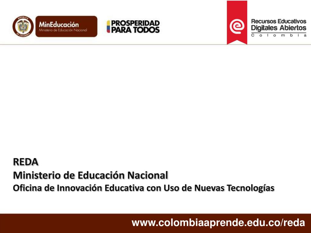Recursos Educativos Digitales Abiertos - REDA. www.colombiaaprende.edu.co/reda. REDA Ministerio de Educación Nacional Oficina de Innovación Educativa con Uso de Nuevas Tecnologías. www.colombiaaprende.edu.co/reda. Sistema Nacional de Recursos Educativos Digitales Abiertos ( REDA).