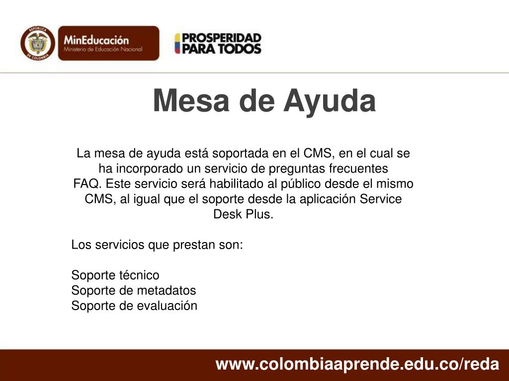 Mesa de Ayuda La mesa de ayuda está soportada en el CMS, en el cual se ha incorporado un servicio de preguntas frecuentes FAQ. Este servicio será habilitado al público desde el mismo CMS, al igual que el soporte desde la aplicación Service Desk Plus. Los servicios que prestan son: Soporte técnico Soporte de metadatos Soporte de evaluación www.colombiaaprende.edu.co/reda