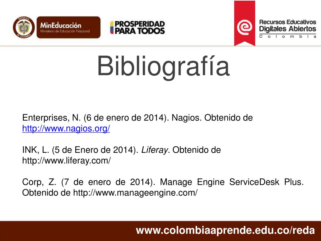 Bibliografía Enterprises, N. (6 de enero de 2014). Nagios. Obtenido de http://www.nagios.org/ INK, L. (5 de Enero de 2014). Liferay. Obtenido de http://www.liferay.com/ Corp, Z. (7 de enero de 2014). ManageEngineServiceDesk Plus. Obtenido de http://www.manageengine.com/ www.colombiaaprende.edu.co/reda