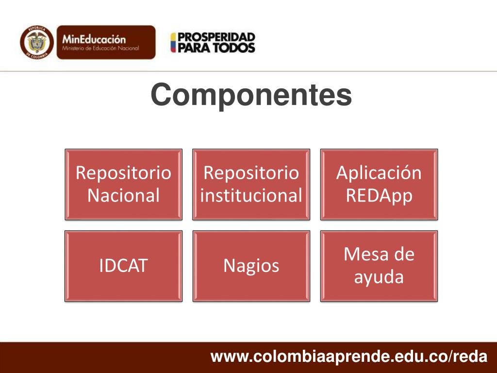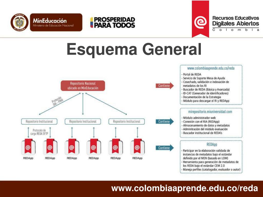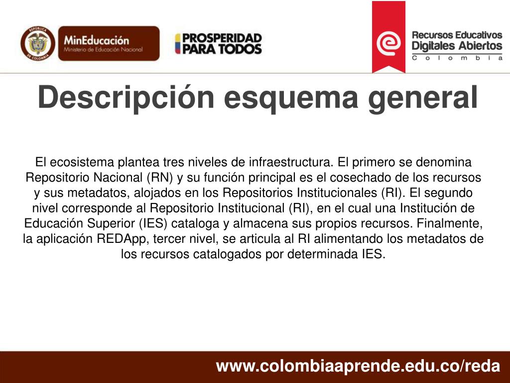 Descripción esquema general El ecosistema plantea tres niveles de infraestructura. El primero se denomina Repositorio Nacional (RN) y su función principal es el cosechado de los recursos y sus metadatos, alojados en los Repositorios Institucionales (RI). El segundo nivel corresponde al Repositorio Institucional (RI), en el cual una Institución de Educación Superior (IES) cataloga y almacena sus propios recursos. Finalmente, la aplicación REDApp, tercer nivel, se articula al RI alimentando los metadatos de los recursos catalogados por determinada IES. www.colombiaaprende.edu.co/reda
