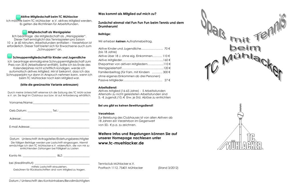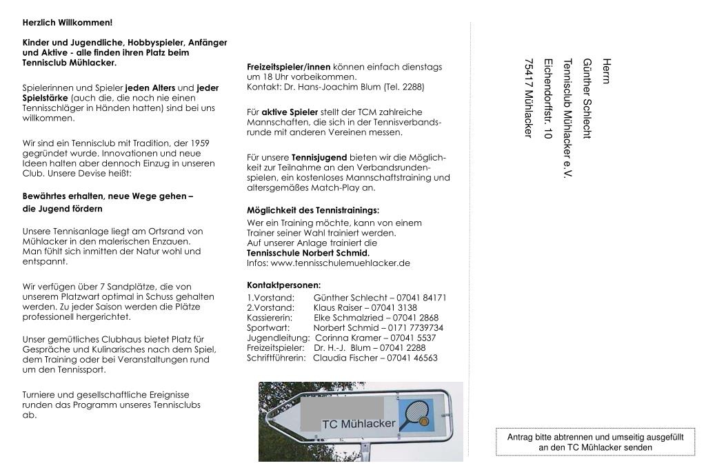 Spaß mit Tennis beim TC Mühlacker. Herrn Günther Schlecht Tennisclub Mühlacker e.V. Eichendorffstr. 10 75417 Mühlacker. Antrag bitte abtrennen und umseitig ausgefüllt an den TC Mühlacker senden.