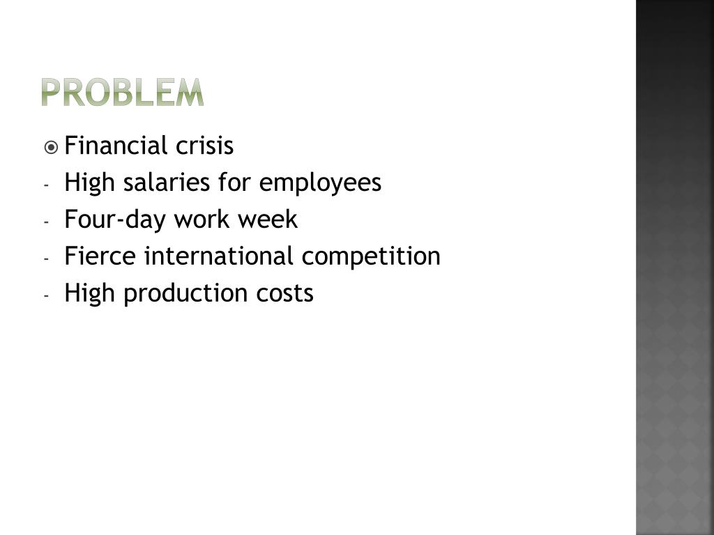 Problem • Financial crisis • High salariesfor employees • Four-daywork week • Fierceinternationalcompetition • High productioncosts