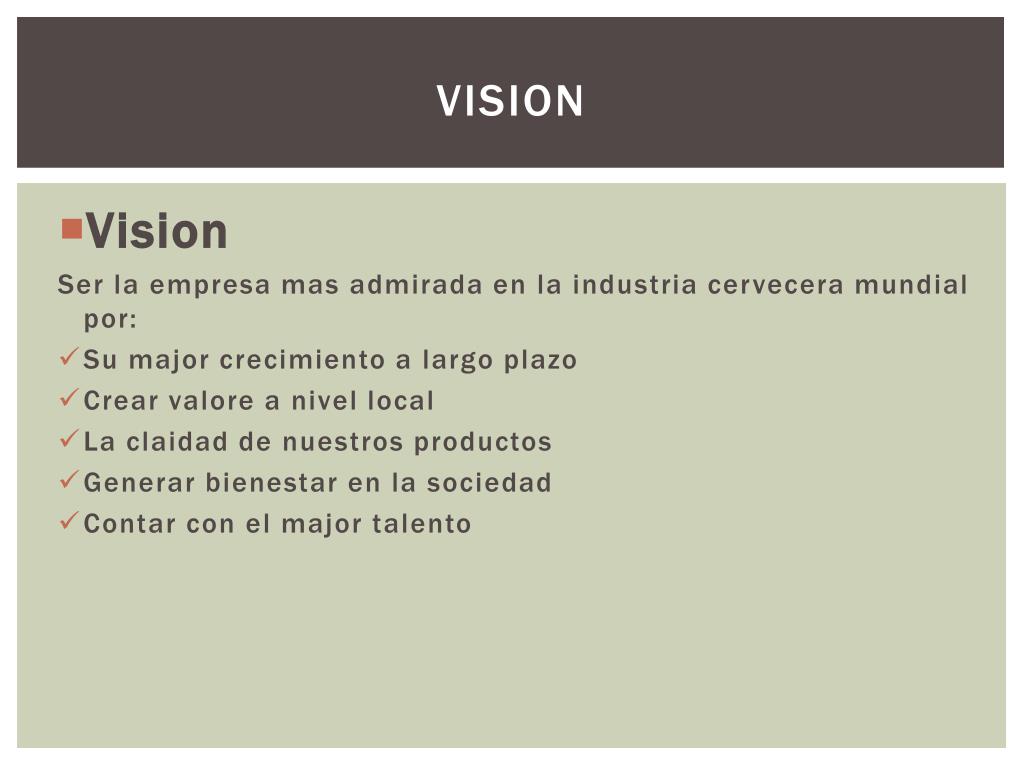 Vision • Vision Ser la empresa mas admirada en la industria cervecera mundial por: • Su major crecimiento a largo plazo • Crear valore a nivel local • La claidad de nuestros productos • Generar bienestar en la sociedad • Contar con el major talento