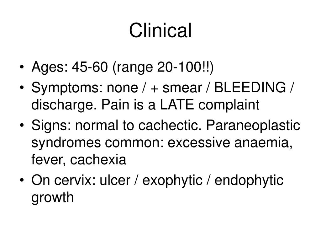 Clinical • Ages: 45-60 (range 20-100!!) • Symptoms: none / + smear / BLEEDING / discharge. Pain is a LATE complaint • Signs: normal to cachectic. Paraneoplastic syndromes common: excessive anaemia, fever, cachexia • On cervix: ulcer / exophytic / endophytic growth