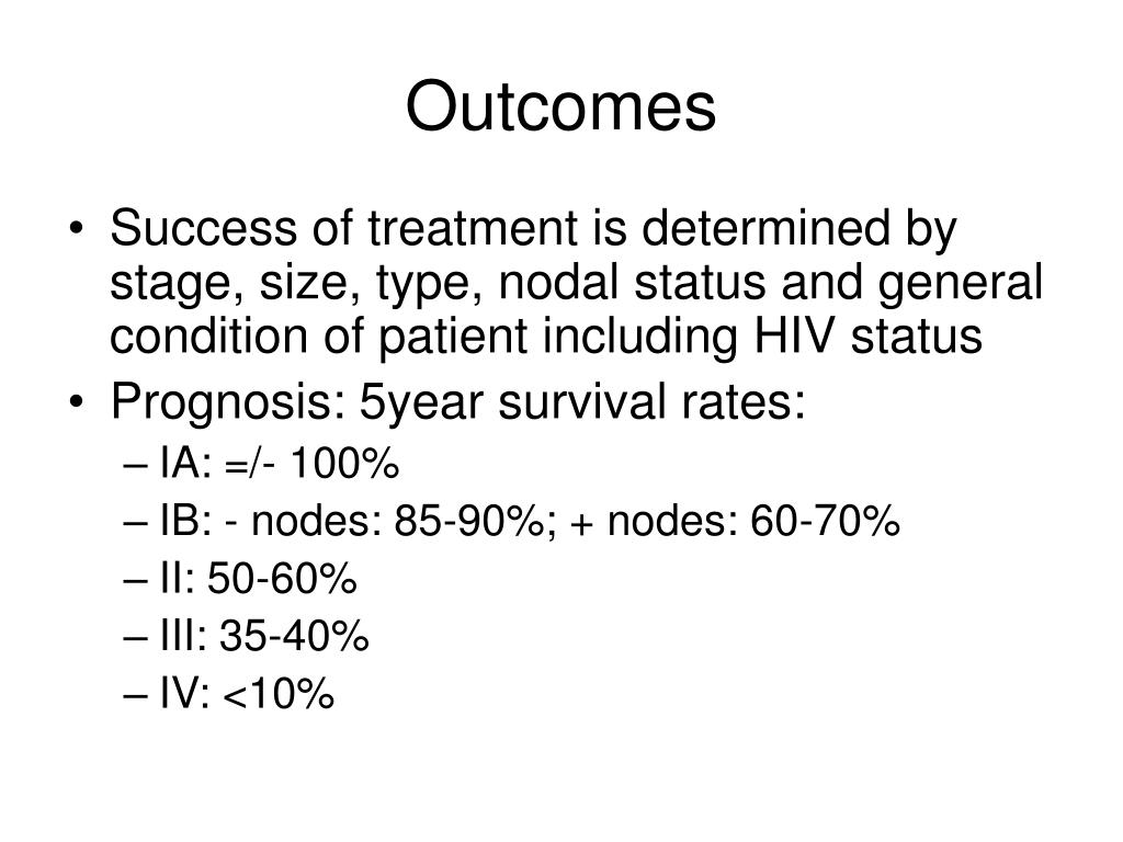 Outcomes • Success of treatment is determined by stage, size, type, nodal status and general condition of patient including HIV status • Prognosis: 5year survival rates: • IA: =/- 100% • IB: - nodes: 85-90%; + nodes: 60-70% • II: 50-60% • III: 35-40% • IV: <10%