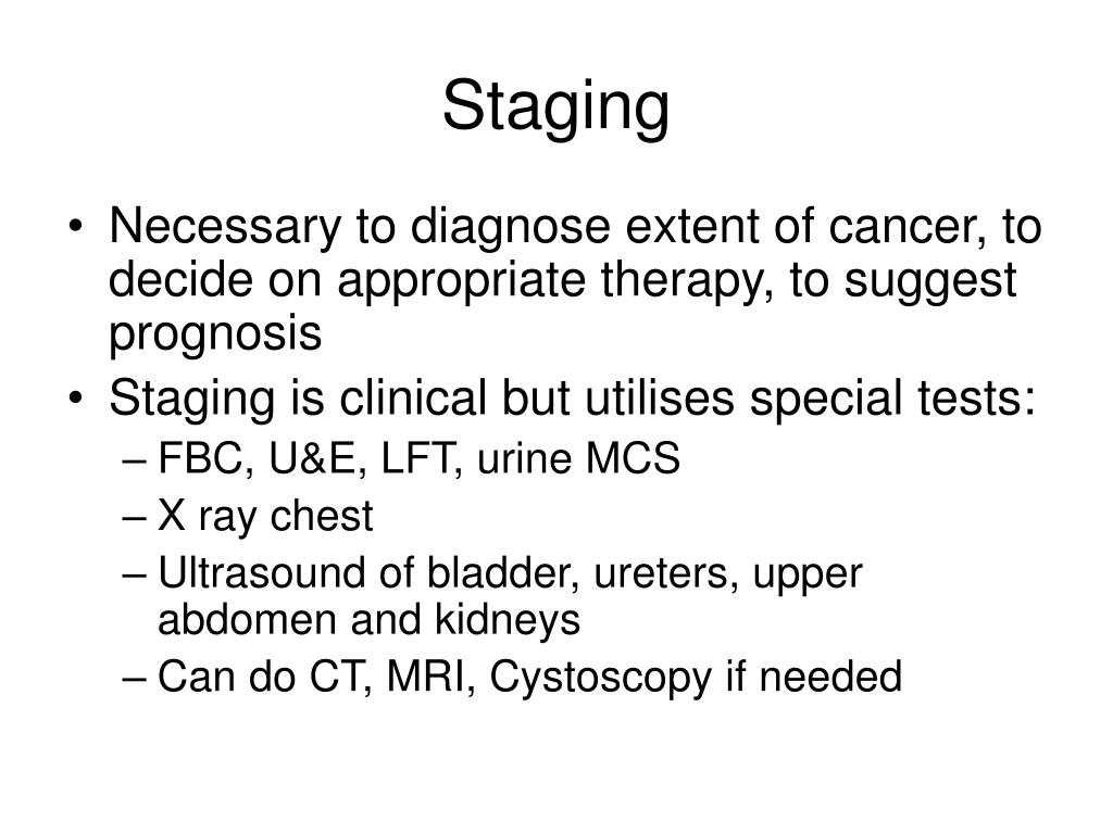 Staging • Necessary to diagnose extent of cancer, to decide on appropriate therapy, to suggest prognosis • Staging is clinical but utilises special tests: • FBC, U&E, LFT, urine MCS • X ray chest • Ultrasound of bladder, ureters, upper abdomen and kidneys • Can do CT, MRI, Cystoscopy if needed