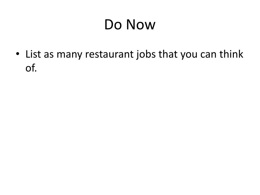 Restaurant Staff. Do Now . List as many restaurant jobs that you can think of. . Front- and Back-of-the-House. General Manager Front-of-the-House Functions Seating Reservation, host, walk-in, open-table, etc. Sales Taking Orders Transmitting Orders to the Kitchen Preparing Orders