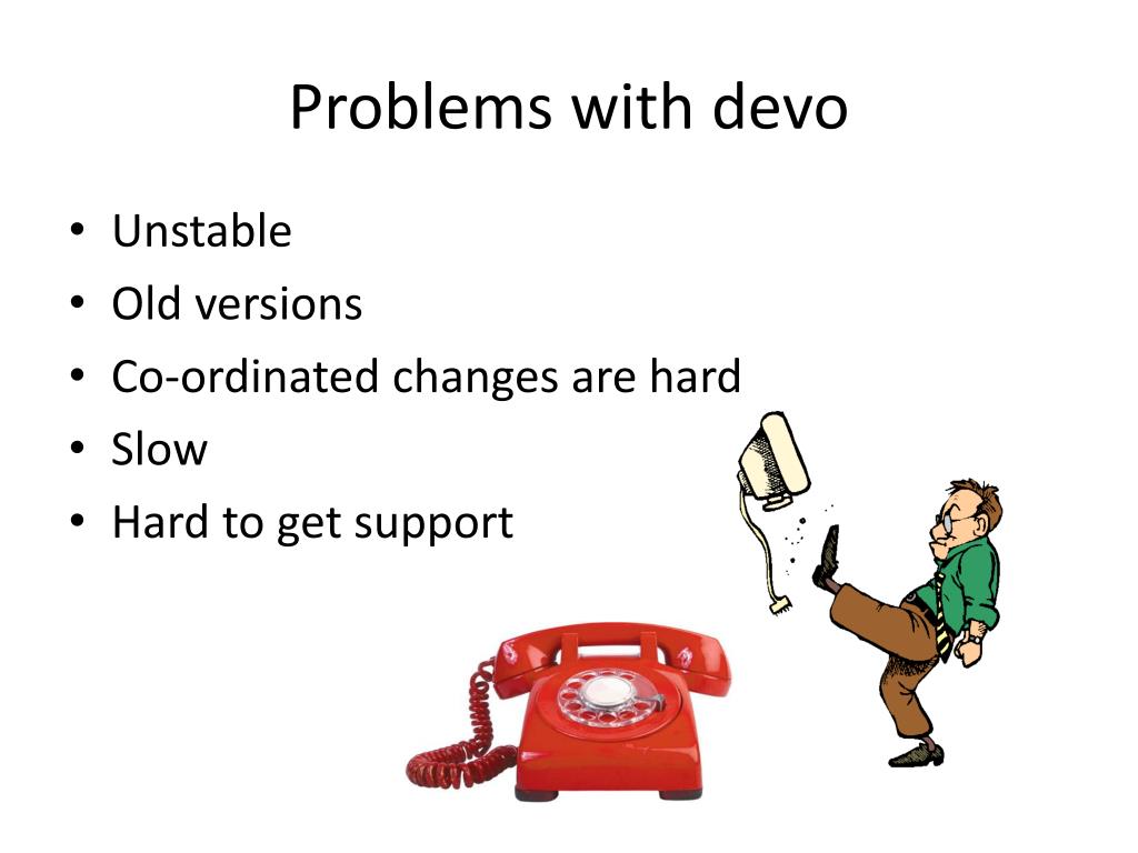 Problems with devo • Unstable • Old versions • Co-ordinated changes are hard • Slow • Hard to get support