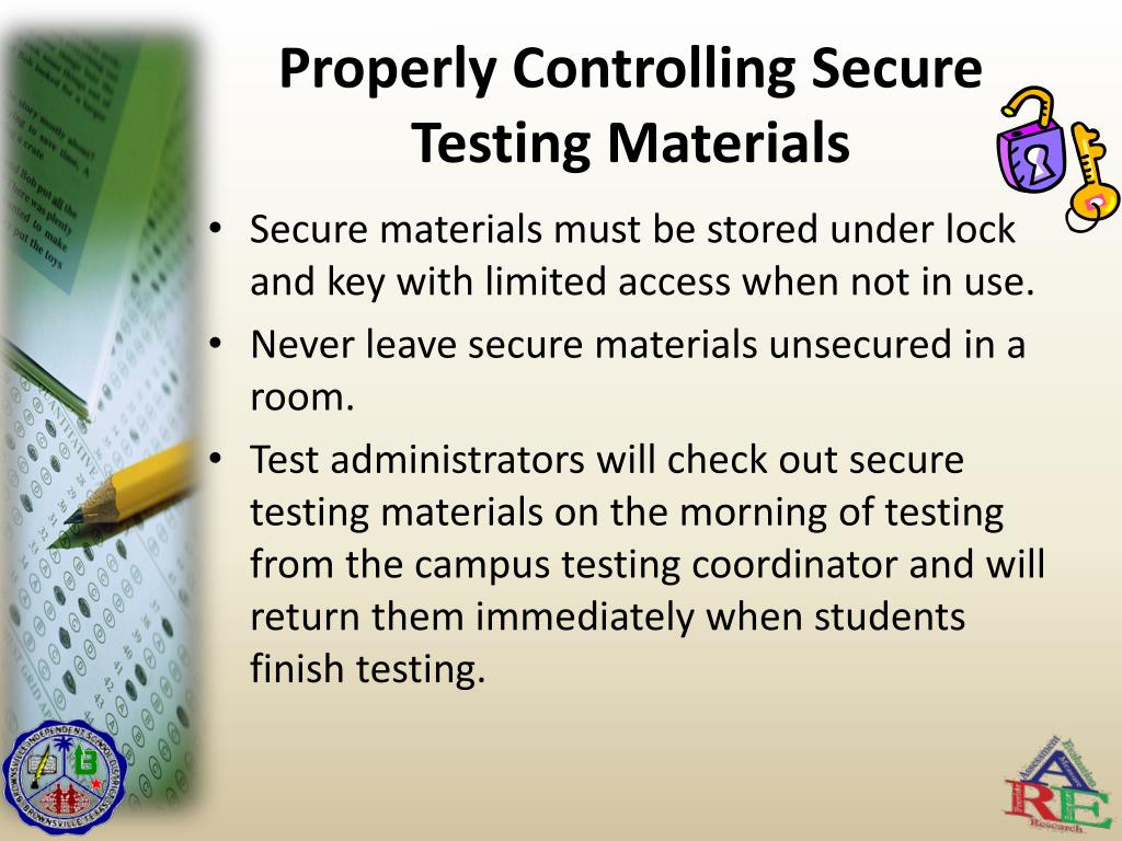 Properly Controlling Secure Testing Materials • Secure materials must be stored under lock and key with limited access when not in use. • Never leave secure materials unsecured in a room. • Test administrators will check out secure testing materials on the morning of testing from the campus testing coordinator and will return them immediately when students finish testing.