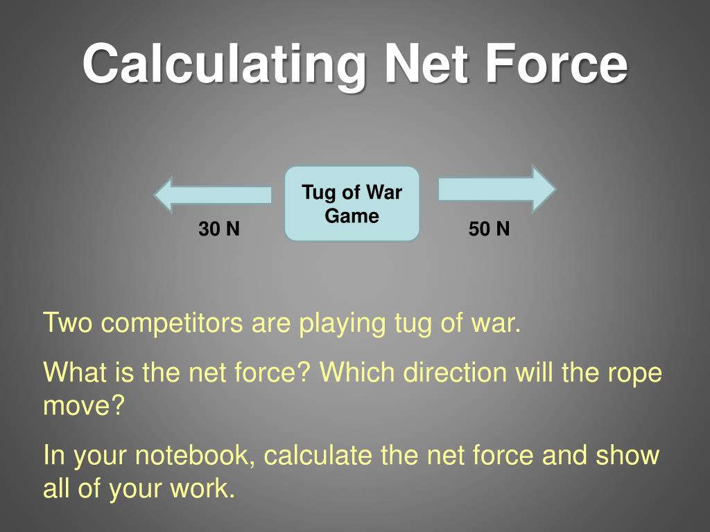 Calculating Net Force Tug of War Game 30 N 50 N Two competitors are playing tug of war. What is the net force? Which direction will the rope move? In your notebook, calculate the net force and show all of your work.