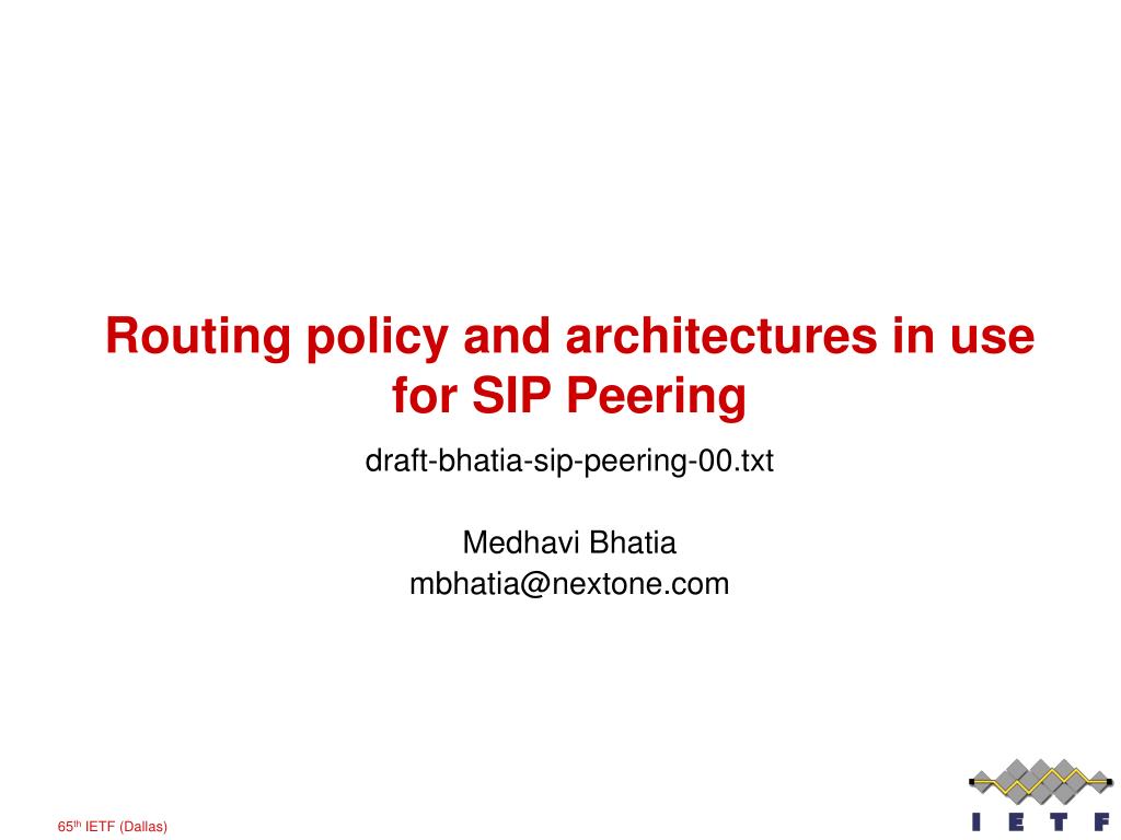 Routing policy and architectures in use for SIP Peering draft-bhatia-sip-peering-00.txt Medhavi Bhatia mbhatia@nextone.com 65th IETF (Dallas)