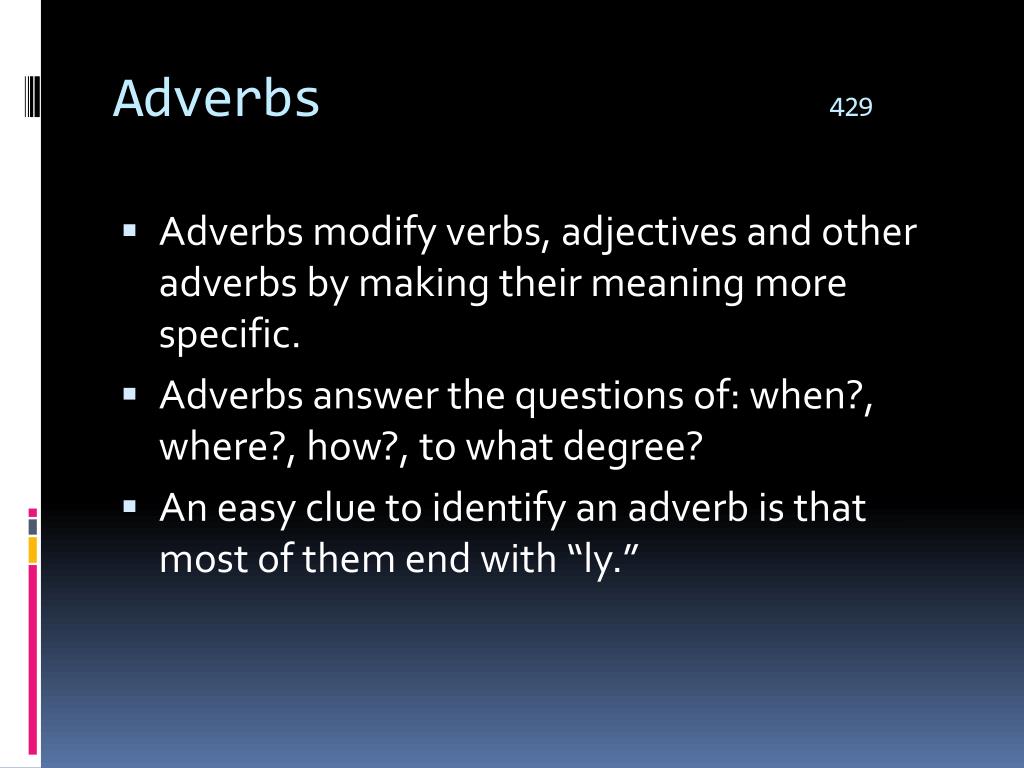 Adverbs 429 • Adverbs modify verbs, adjectives and other adverbs by making their meaning more specific. • Adverbs answer the questions of: when?, where?, how?, to what degree? • An easy clue to identify an adverb is that most of them end with “ly.”