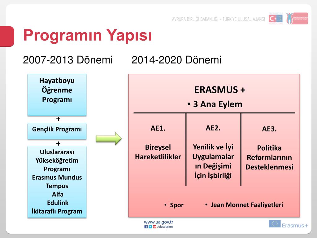 Programın Yapısı Hayatboyu Öğrenme Programı ERASMUS + • 3 Ana Eylem + AE2. Yenilik ve İyi Uygulamaların Değişimi İçin İşbirliği AE1. Bireysel Hareketlilikler AE3. Politika Reformlarının Desteklenmesi Gençlik Programı + Uluslararası Yükseköğretim Programı ErasmusMundus Tempus Alfa Edulink İkitaraflı Program • Jean Monnet Faaliyetleri • Spor 2007-2013 Dönemi 2014-2020 Dönemi