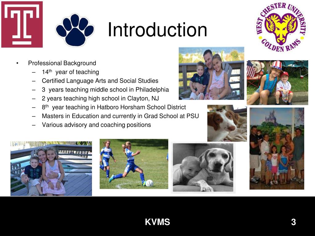Introduction • Professional Background • 14th year of teaching • Certified Language Arts and Social Studies • 3 years teaching middle school in Philadelphia • 2 years teaching high school in Clayton, NJ • 8th year teaching in Hatboro Horsham School District • Masters in Education and currently in Grad School at PSU • Various advisory and coaching positions KVMS