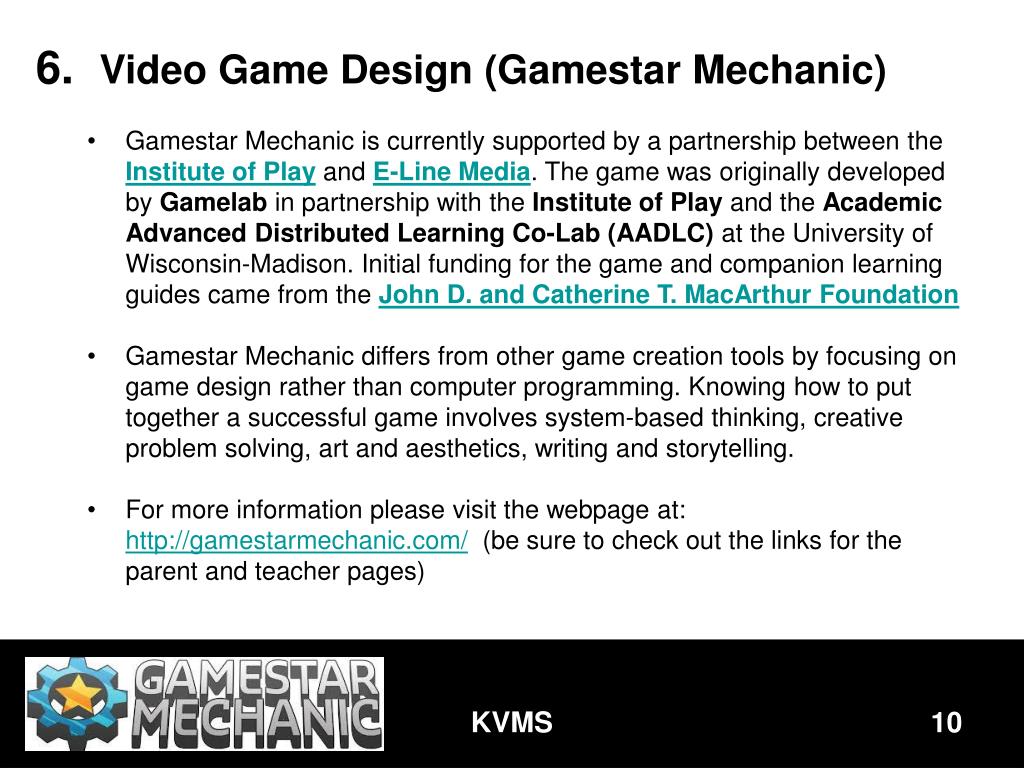 Video Game Design (Gamestar Mechanic) • Gamestar Mechanic is currently supported by a partnership between the Institute of Play and E-Line Media. The game was originally developed by Gamelab in partnership with the Institute of Play and the Academic Advanced Distributed Learning Co-Lab (AADLC) at the University of Wisconsin-Madison. Initial funding for the game and companion learning guides came from the John D. and Catherine T. MacArthur Foundation • Gamestar Mechanic differs from other game creation tools by focusing on game design rather than computer programming. Knowing how to put together a successful game involves system-based thinking, creative problem solving, art and aesthetics, writing and storytelling. • For more information please visit the webpage at: • http://gamestarmechanic.com/ (be sure to check out the links for the parent and teacher pages) KVMS