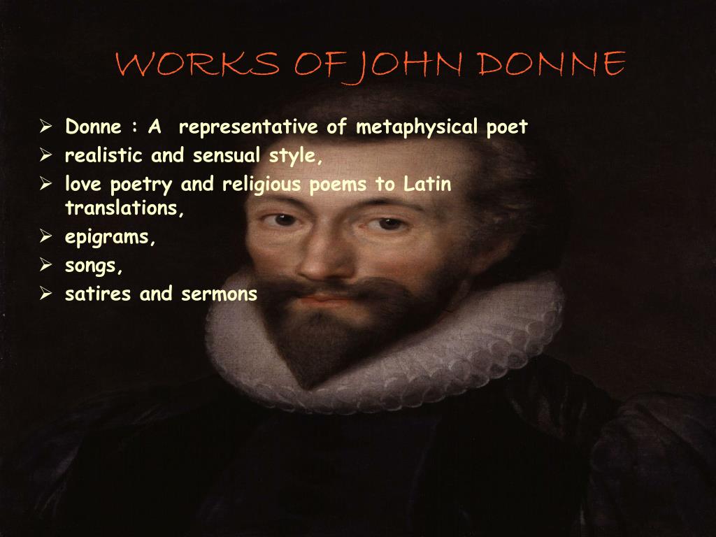 WORKS OF JOHN DONNE • Donne : A representative of metaphysical poet • realistic and sensual style, • love poetry and religious poems to Latin translations, • epigrams, • songs, • satires and sermons