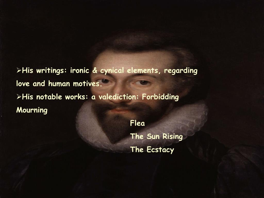 His writings: ironic & cynical elements, regarding love and human motives. • His notableworks: a valediction: ForbiddingMourning Flea The Sun Rising TheEcstacy