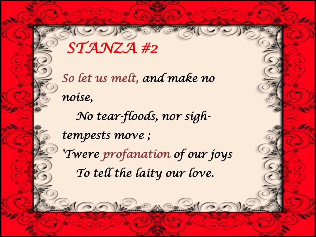 STANZA #2 So let us melt, and make no noise, No tear-floods, nor sigh-tempests move ; 'Twereprofanation of our joys To tell the laity our love.