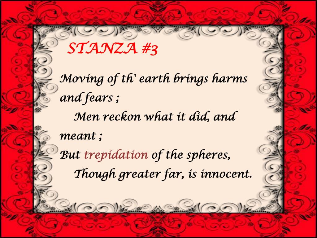 STANZA #3 Moving of th' earth brings harms and fears ; Men reckon what it did, and meant ; But trepidation of the spheres, Though greater far, is innocent.