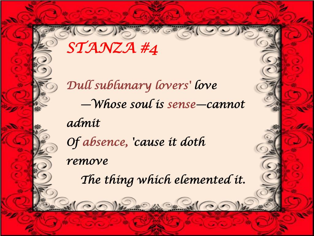 STANZA #4 Dull sublunary lovers' love —Whose soul is sense—cannot admit Of absence, 'cause it doth remove The thing which elemented it.