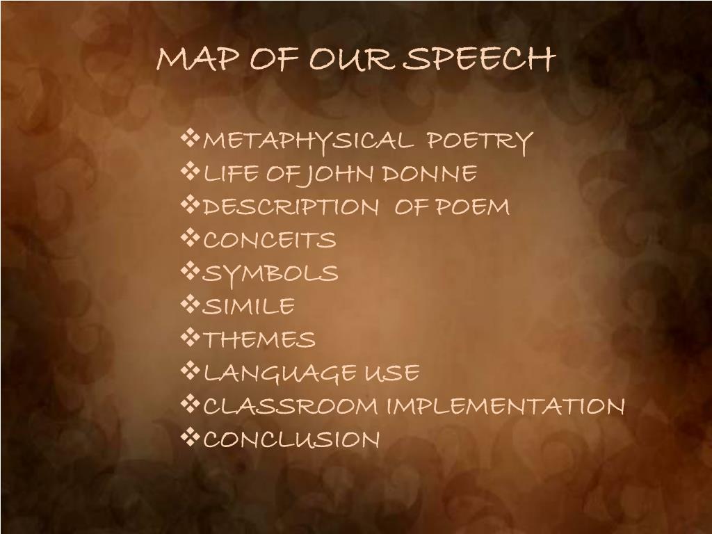 MAP OF OUR SPEECH • METAPHYSICAL POETRY • LIFE OF JOHN DONNE • DESCRIPTION OF POEM • CONCEITS • SYMBOLS • SIMILE • THEMES • LANGUAGE USE • CLASSROOM IMPLEMENTATION • CONCLUSION