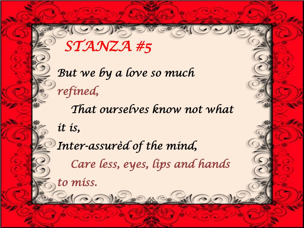 STANZA #5 But we by a love so much refined, That ourselves know not what it is, Inter-assurèd of the mind, Care less, eyes, lips and hands to miss.